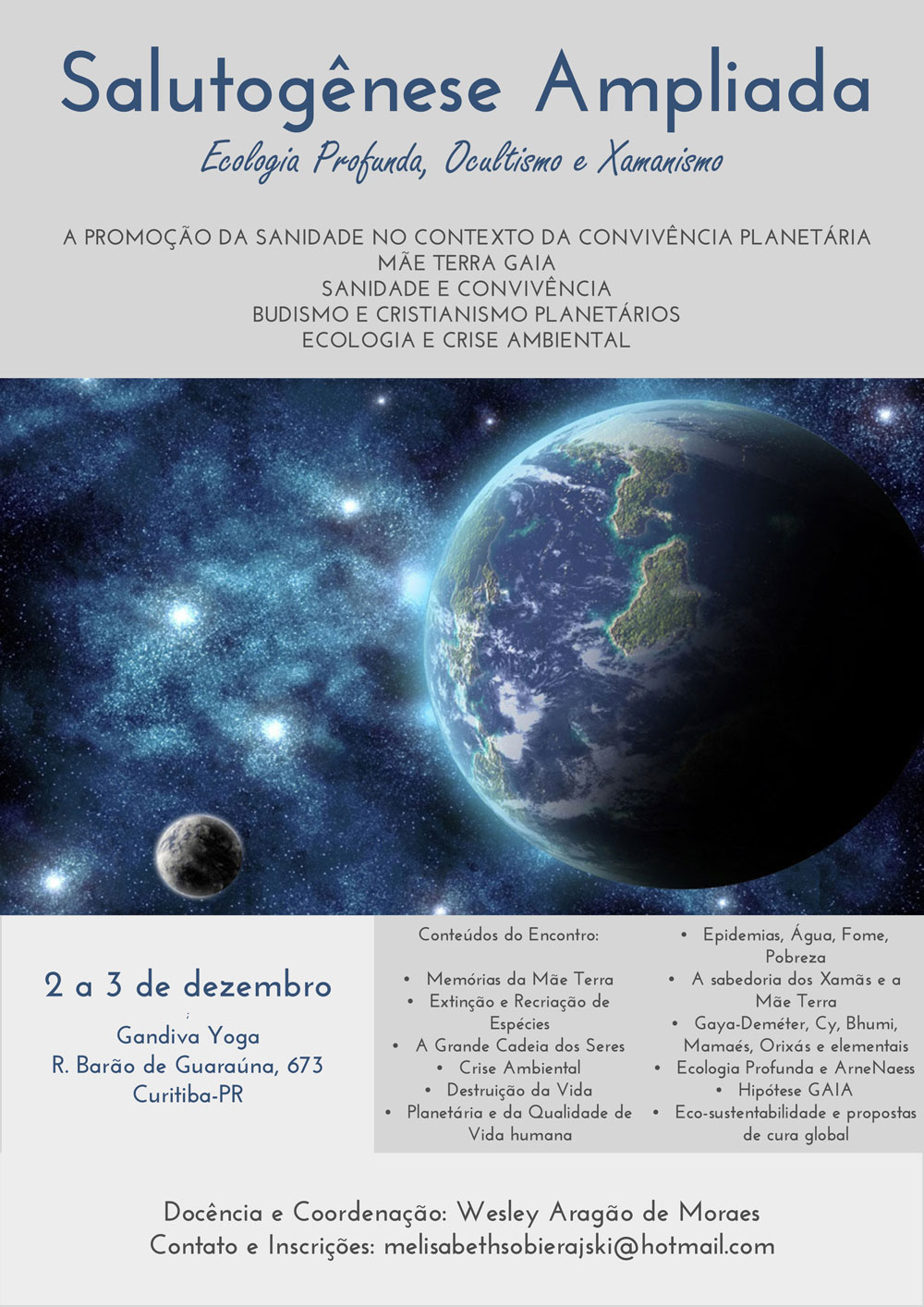 MÓDULO 8 – 2017 (data à definir) – ECOLOGIA PROFUNDA, AMBIENTE, PLANETA  E SANIDADE – interdependência entre homem e ecossistema. Sanidade do homem, sanidade planetária. Gaia, a Terra como organismo vivo e sensciente. Os elementais e sua interação com o homem. Desequilíbrio ambiental e os elementais. A cadeia dos seres vivos: a evolução das plantas e dos animais e sua relação com a evolução humana.